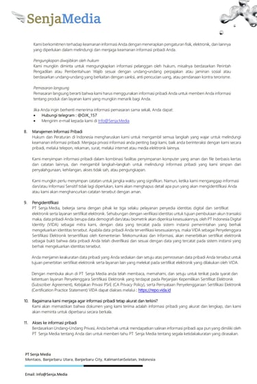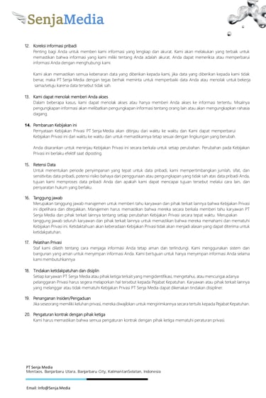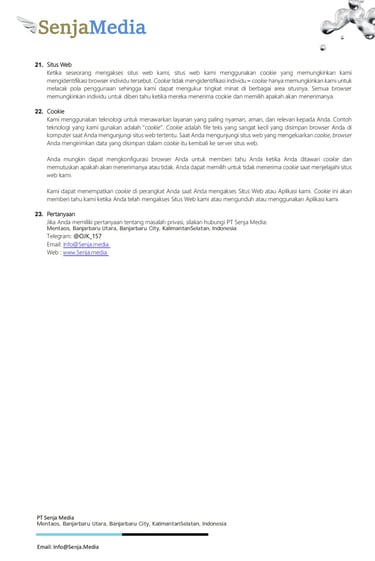 Kebijakan ini berlaku untuk PT Senja Media atau entitas terkait dari PT Senja Media, yang semuanya disebut sebagai "PT Senja Media, "Senja Media", "kami", atau "kita"Kebijakan ini meluas ke dan mencakup semua operasi dan fungsi PT Senja Media.